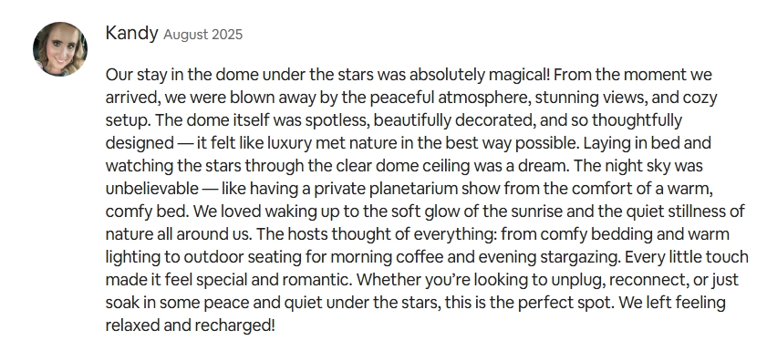 2025 marked an exciting milestone as we completed our first full calendar year of guests in our stunning new hard-shell glass domes. We upgraded our domes from PVC tarps to glass domes at the beginning of 2024. These domes are not only more robust against the elements but also offer enhanced soundproofing and superior climate control for your ultimate comfort. With larger bay windows, guests can indulge in breathtaking sky views right from their beds. As the only glass domes in all of Texas, they provide a unique and luxurious experience that combines nature with modern amenities. Join us in celebrating a year filled with unforgettable moments and breathtaking views!